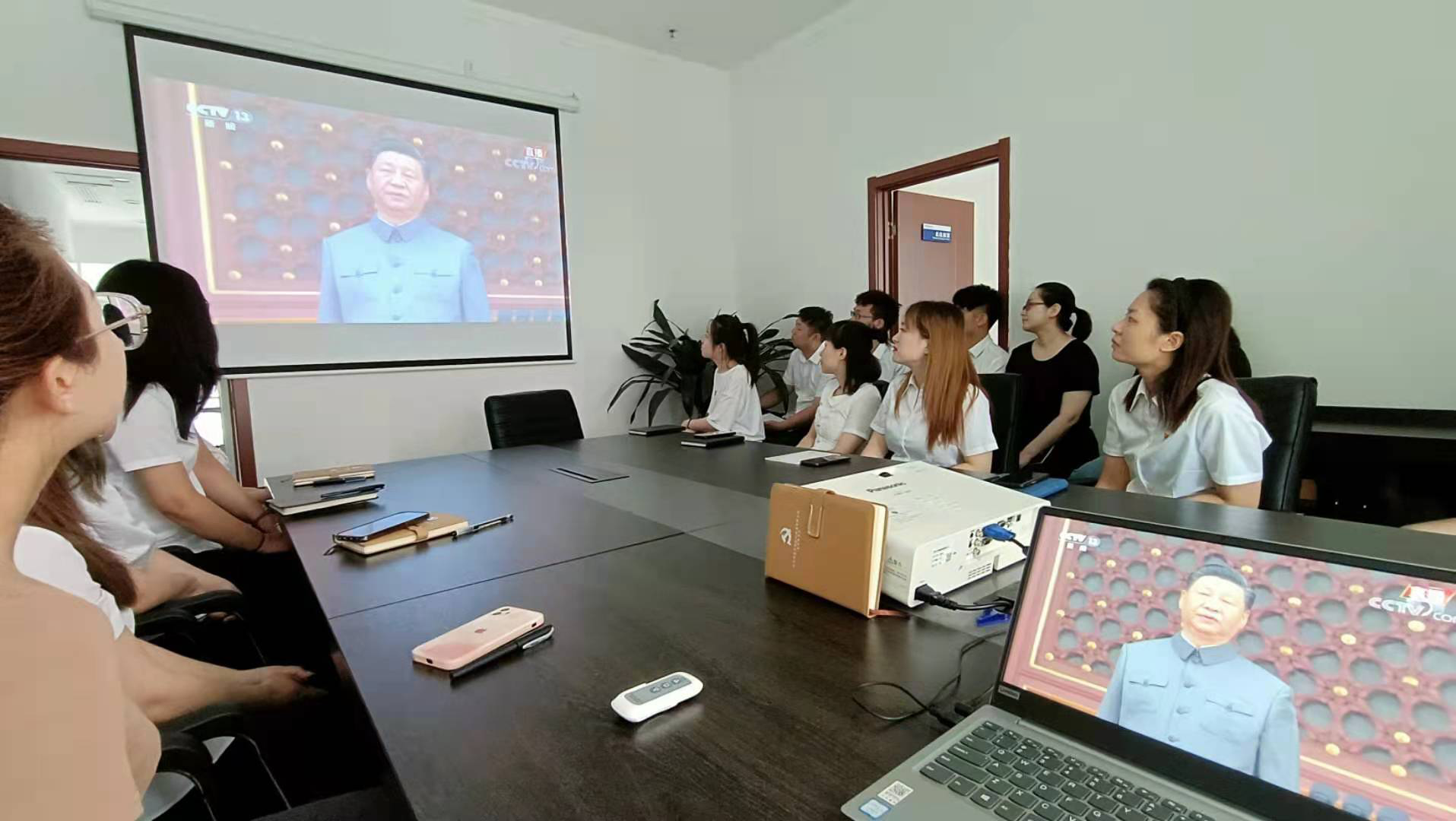 通過大屏幕,看到習近平同黨和國家領(lǐng)導人登上天安門城樓主席臺,看到天安門廣場人頭攢動時,大家目不轉(zhuǎn)睛、聚精會神、認真收看。電視直播期間,認真聆聽習近平總書記的重要講話,邊看邊記筆記,總書記振奮人心的講話,會議室不時響起掌聲。一小時四十分鐘的直播,大家始終沉浸在熱烈莊重、恢宏磅礴的慶祝氛圍之中。大家紛紛認為,百年恰是風華正茂,未來仍需風雨兼程,站在新的歷史起點上,更須不忘初心,砥礪前行。